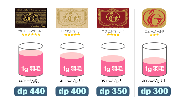 その数値によって、日本羽毛製品協同組合が4つのグレードに区分し、ゴールドラベルを発行しています。